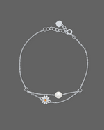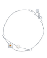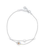 This 925 silver bracelet features a unique double-layered chain design. One chain showcases a delicate white pearl, while the other holds a charming daisy flower charm with an orange-hued center, accompanied by a tiny clear stone. The bracelet is adjustable with an extender chain and a lobster clasp, offering a playful yet elegant aesthetic.