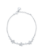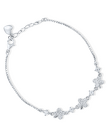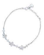This elegant 925 silver bracelet features a central design of three sparkling butterfly charms, each intricately paved with clear cubic zirconia stones. These butterflies are interspersed with smaller, four-pronged clear stones. The bracelet is completed with a delicate box chain, an adjustable extender, and a lobster clasp, along with a small heart charm.