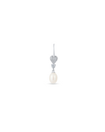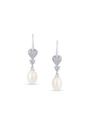 These delightful silver dangle earrings feature a romantic design, showcasing a lustrous teardrop pearl suspended beneath a sparkling Cubic Zirconia (CZ) accent. Above the CZ, a charming heart-shaped motif, also embellished with CZ stones, completes the elegant look. These earrings are perfect for adding a touch of romance and sparkle to any ensemble, ideal for special occasions or a thoughtful gift.