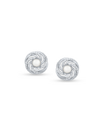 These striking silver stud earrings feature a central, luminous pearl encircled by a swirling, pavé-set Cubic Zirconia (CZ) design. The intricate twist pattern, adorned with sparkling CZ stones, creates a dynamic and luxurious halo around the pearl. These captivating earrings are perfect for adding a touch of sophisticated glamour and brilliance to any outfit.