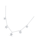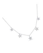 This delightful 925 silver necklace features a delicate chain adorned with five sparkling star-shaped charms. Each star is intricately pave-set with numerous cubic zirconia (CZ) stones, creating a brilliant and captivating shimmer. The evenly spaced stars give the necklace a whimsical yet elegant appearance, perfect for adding a touch of celestial charm to any outfit.