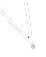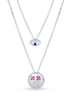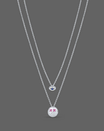 This image showcases a set of two layered silver necklaces. The shorter necklace features a small, minimalist "evil eye" charm with a blue center stone. The longer necklace has a larger, circular disc pendant adorned with a pattern of multiple small, vibrant pink or red gemstones, possibly forming a floral or abstract motif.