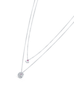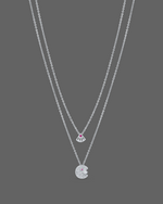 This image displays a stylish layered silver necklace set. The shorter chain features a unique fan-shaped or fanned bar pendant with a small, central pink gemstone. The longer chain showcases a playful Pac-Man shaped pendant, fully adorned with pave-set clear gemstones and a singular pink gemstone for the iconic "mouth."