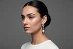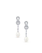 These sophisticated silver drop earrings feature an elegant top design, resembling a stylized knot or infinity symbol, entirely encrusted with sparkling cubic zirconia (CZ) stones. From this dazzling upper portion, a delicate chain descends, adorned with two additional bezel-set CZ stones, leading to a lustrous, drop-shaped pearl. The combination of brilliant CZ and classic pearls creates a refined and glamorous accessory, perfect for formal events or adding a touch of timeless elegance.