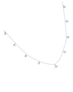 This minimalist silver necklace features a delicate chain adorned with eleven evenly spaced, bezel-set cubic zirconia (CZ) stones. Each CZ stone dangles gently, catching the light with every movement. The design offers a subtle yet brilliant sparkle, making it a timeless and versatile piece perfect for everyday wear or layering with other necklaces.