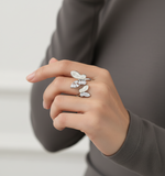 This is an elegant open-ended ring featuring a dynamic butterfly design. Two wings are crafted from lustrous mother-of-pearl, while the other two sparkle with a mix of baguette and round cubic zirconia stones. The polished silver-toned band gracefully supports this captivating and sophisticated piece.
